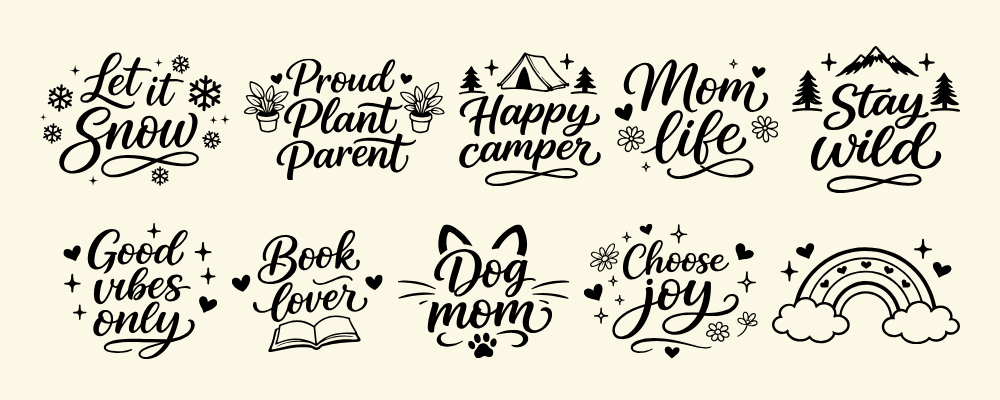 Du får enkla designer som passar perfekt för muggar, vinyl, dekaler, klistermärken och andra nybörjarprojekt – så att du snabbt kan testa din Cricut och komma igång med roliga projekt.